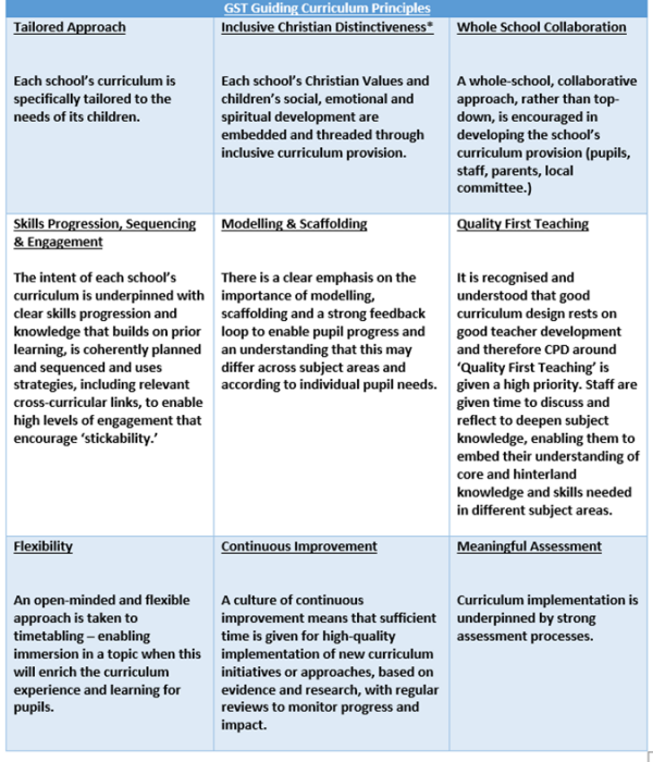 As part of the work of this group, we have developed a set of guiding principles. Our aim is to ensure that every Good Shepherd Trust school is providing a high-quality curriculum for its pupils in line with these nine principles: